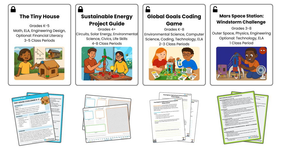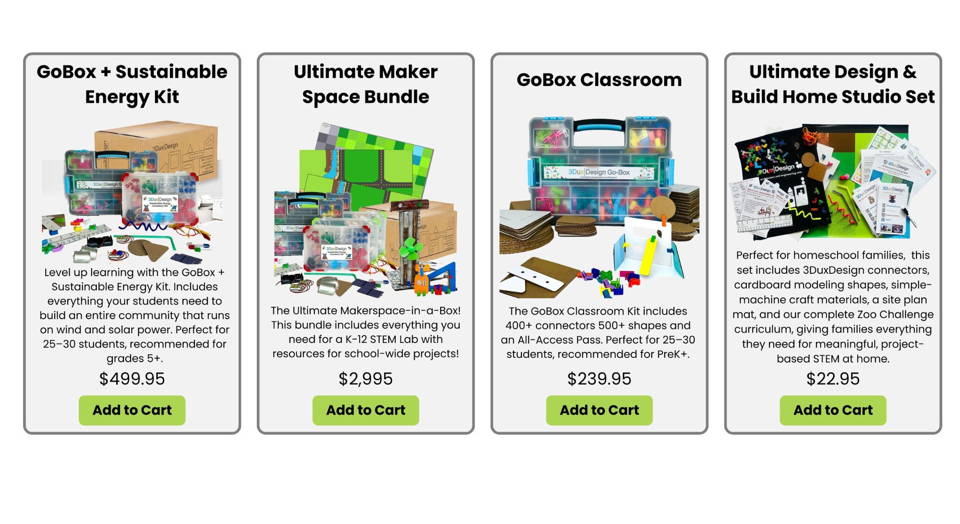 3DuxDesign offers a wide range of product and project options for your K-12 students, from 20-60 minute Basic Design Challenges to our 1-4 hour Standards-Aligned Lesson Plans or our full 15+ hour Community Build Curriculum. Whether you're an educator new to project-based learning or a seasoned STEM expert, we have materials and resources that are easy to implement and will be sure to delight your students.