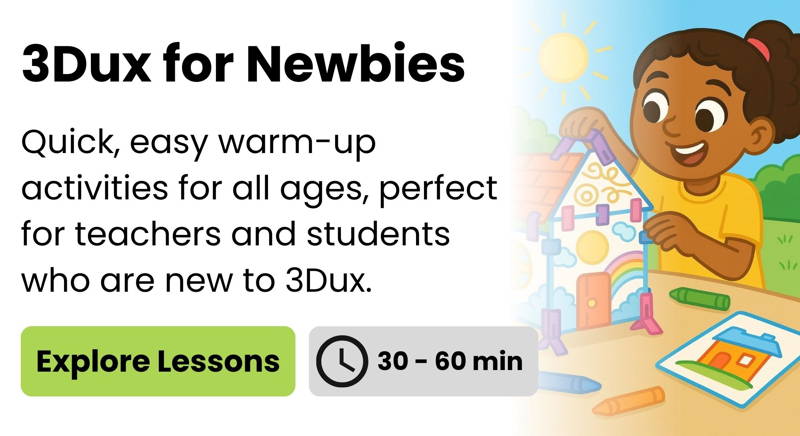 At 3DuxDesign, we believe innovation is not only about math and science, but also art, design, the natural environment, and humanity. Our hands-on design challenges help students imagine, design, build, and share real-world solutions through creative community-centered projects. 3DuxUniversity brings learning beyond the classroom with scaffolded resources for grades PreK - 12, from quick 30 minute activities to full 15+ hour curricula that spark creativity, engineering thinking, and problem solving.